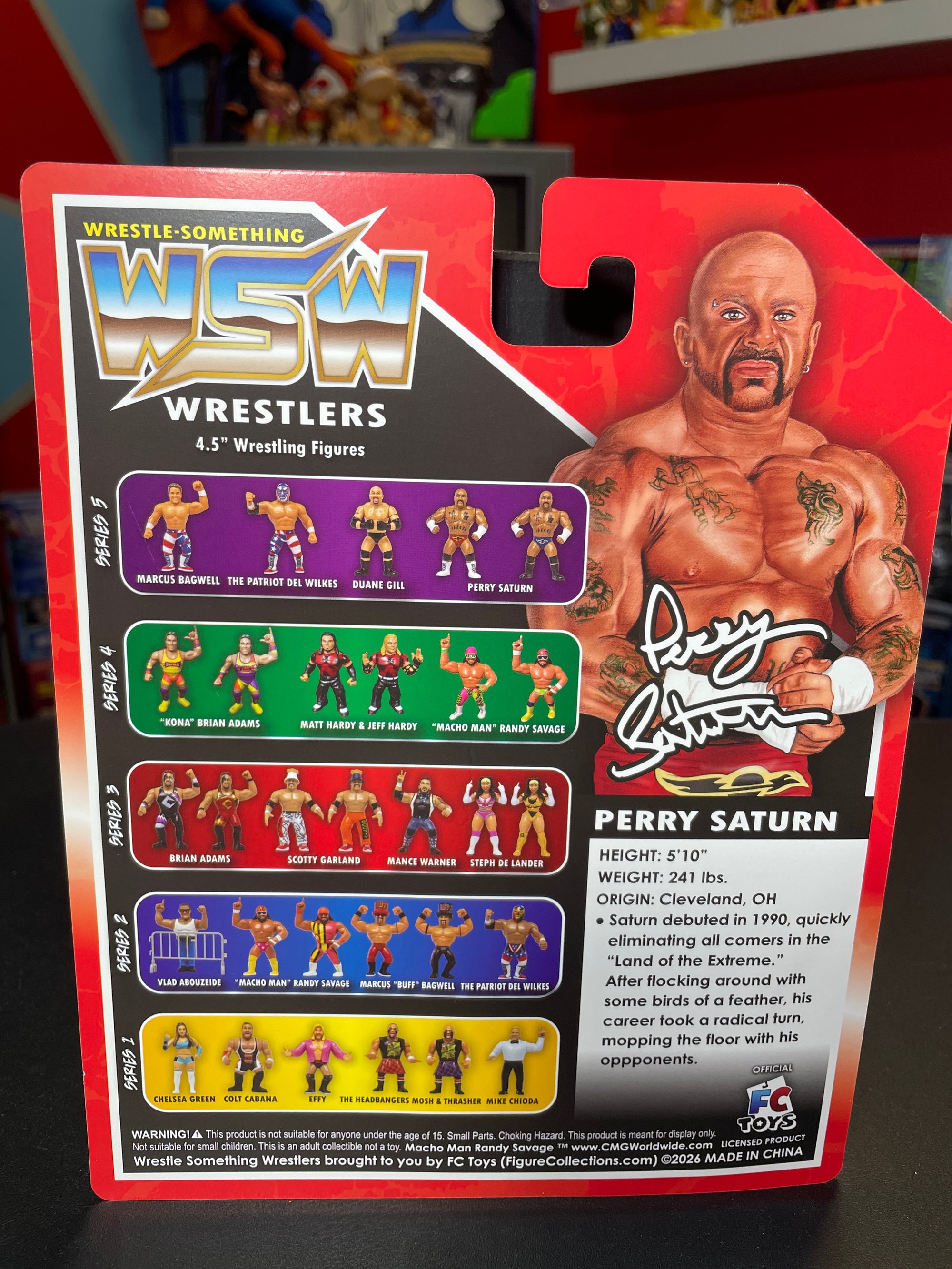 Perry Saturn is known across this planet for his radical run across many wrestling promotions in the 1990s eliminating challengers and flocking around! His career would take a radical turn, mopping the floor with his challengers. He is not afraid of your figure collection!